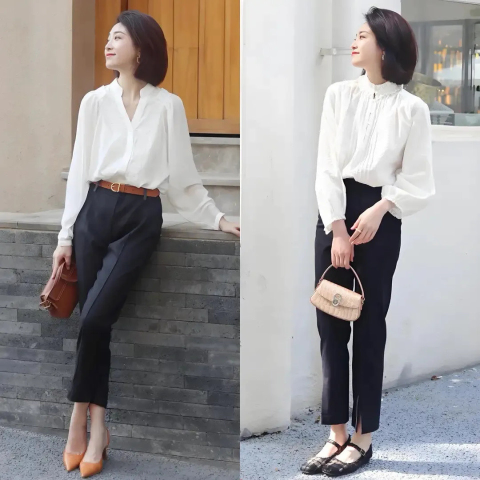 特别是职场女性,我们就可以选择像下面这样的白色小众衬衫来搭配上黑色的9分西装,裤脚上穿的一双驼色的浅口高跟单鞋,或者是一双玛丽珍鞋,这样的穿衣打扮,不管是穿去上班,逛街或者是约会都没有任何问题,显得比较通勤时髦。