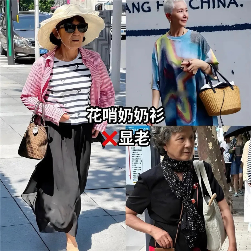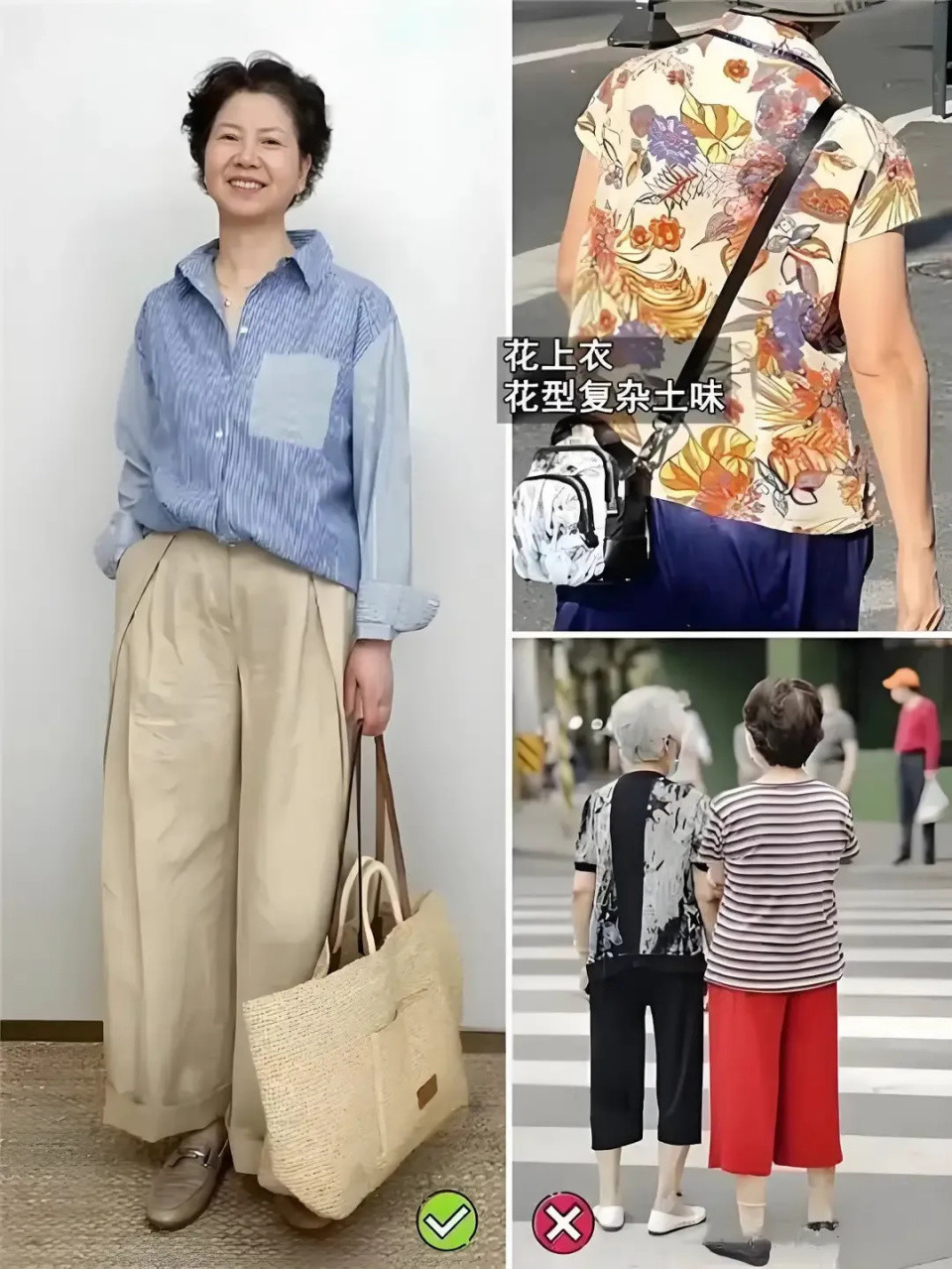 像下面这样的衣服就尽量不要穿了,一件花少奶奶衫穿在身上,瞬间显老显土,用一件条纹的衬衫内搭黑白条纹打底衫和一款黑色的阔腿裤,甚至是渐变色的宽松短袖上衣,这样的衣服就算是高颜值的女性穿了也很难驾驭的住。
