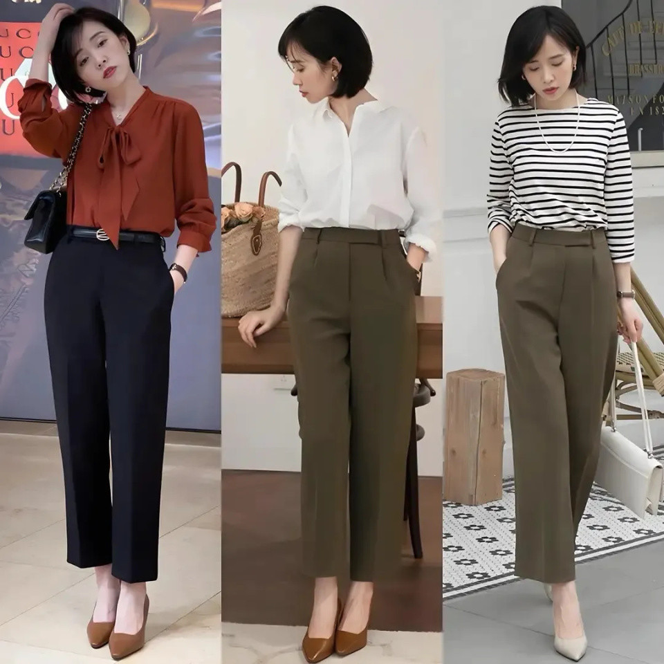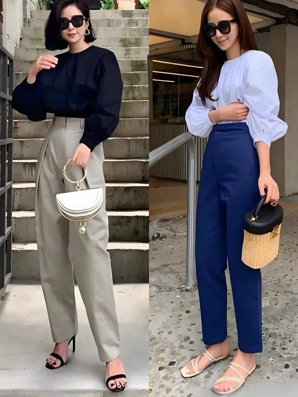 长相偏成熟的女性国鸣投资,直接选择下面这种小灯笼袖的衬衫上衣来搭配上高腰休闲款的西装裤,呈现出来的效果简约干练。