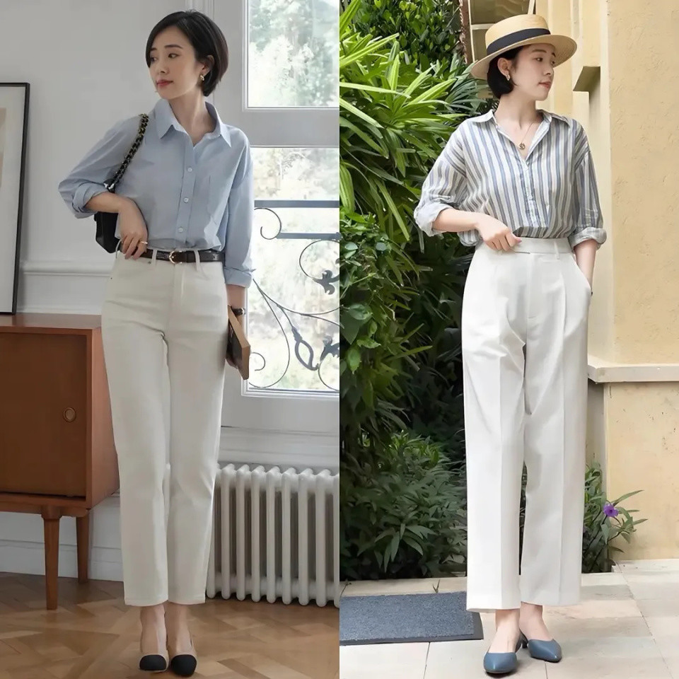 右边的这一套穿搭同样也是选择九分裤,这一条白色的西装九分裤是属于直筒的版型,腿型不是那么的修长笔直,选择这样的西装裤更能修饰腿部线条,再加上灰白条纹的衬衫上衣更能修饰你身体线条感。