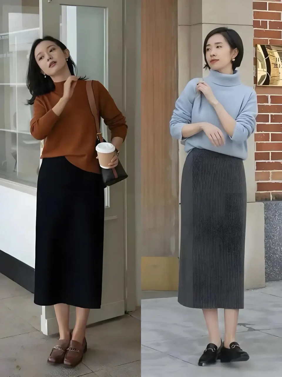 北方城市的女性已经可以选择下面这样的穿搭技巧了,用针织上衣来搭配上针织直筒半身裙,脚上穿的一双乐福鞋就够,轻轻松松穿出温柔感,最主要的是让你更加保暖。