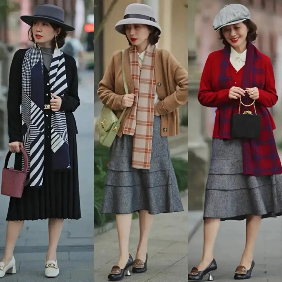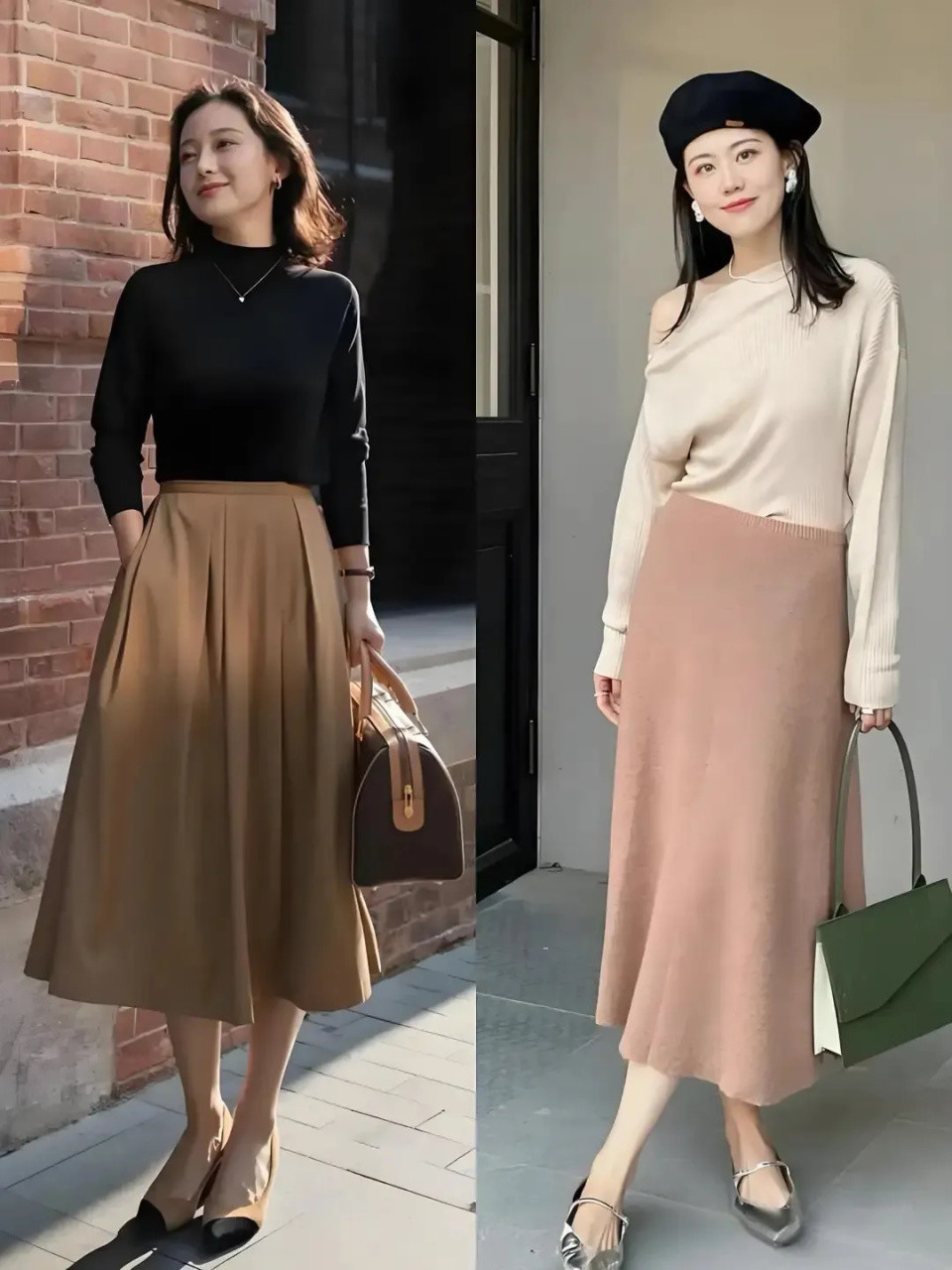 女性也同样采用这样的穿搭方式,例如下面用针织开衫内搭一件打底衫,加上一款灰色的半身裙或者是黑色的白色半身裙,这样的造型温柔得体,最主要是保暖舒适。