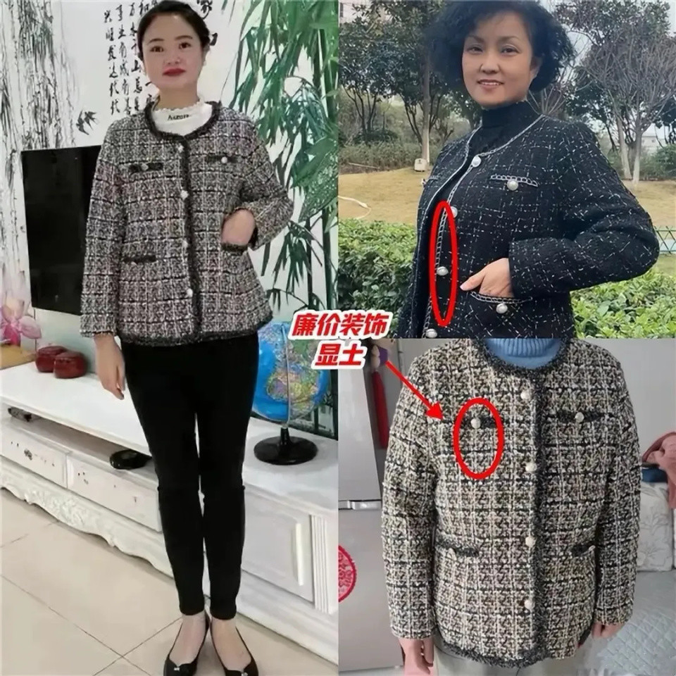 本身像下面这种小香风外套,天生就拥有时尚元素,而且应该是很精致的衣服单品,穿在身上就能让穿搭者显贵,但是因为衣服装饰过于廉价,瞬间拉低了整体的穿衣造型档次。