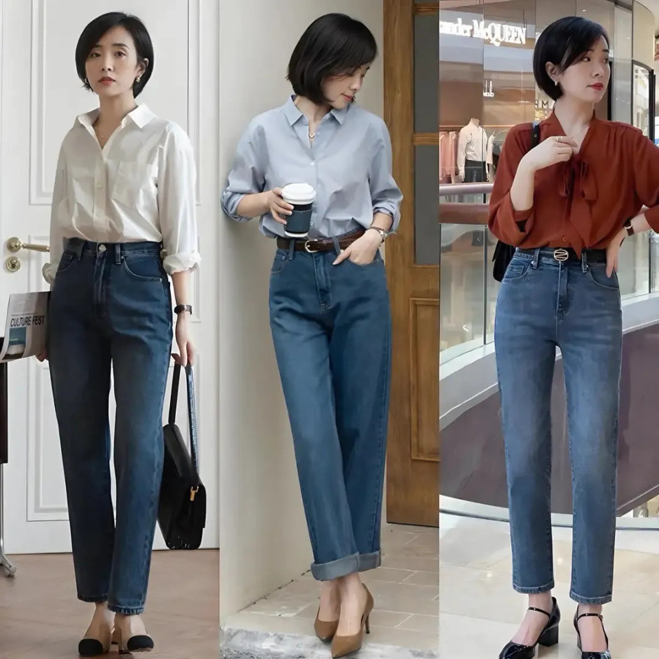 如果咱们是小个子女性就可以借鉴一下这位达人的穿搭方式,她就是属于1米60以下的小个子女性,直接用一件白色,蓝色,棕红色的衬衫上衣来搭配上天生就拥有时尚元素的蓝色牛仔裤,脚上穿的一双粗跟浅口单鞋,玛丽珍鞋,高跟鞋,轻轻松松穿出显高显瘦的造型。